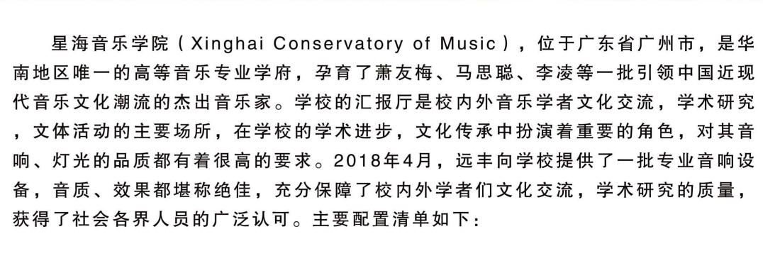 星海音樂學(xué)院,位于廣東省廣州市,2019年4月,遠(yuǎn)豐為其音樂報告廳提供了一批專業(yè)音響以及舞臺燈光設(shè)備,滿足了師生們的文化交流以及文體活動需求。